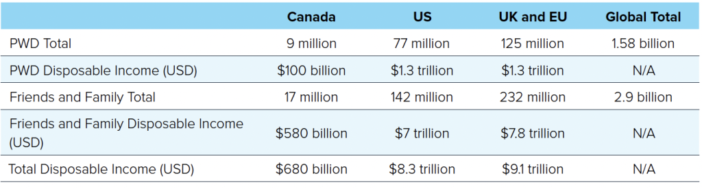 2 $2.6 trillion USD represents the disposable income of those with disabilities aged 25-64 in Canada, the E.U., U.K., and U.S. alone.