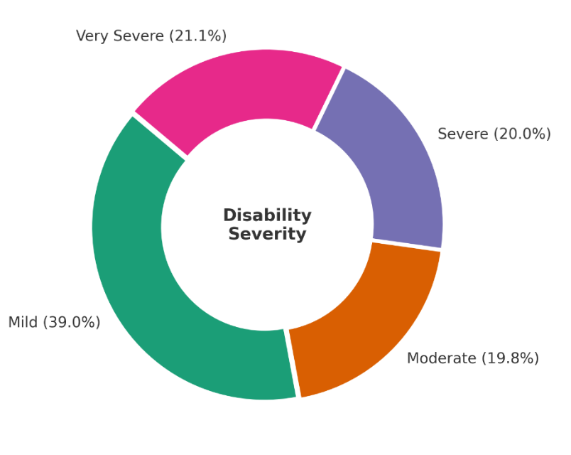 In terms of severity, the most common is mild, with about 40% of respondents falling into this assessment category. Moderate, Severe, and Very Severe each represent about 20% of respondents (see Figure 1).