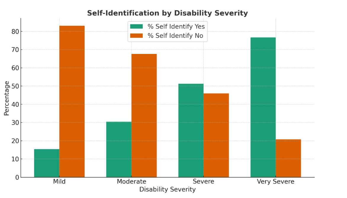 A critical takeaway is that there is a large number of individuals – including those with more severe impairments – that do not self-identify as having a disability.